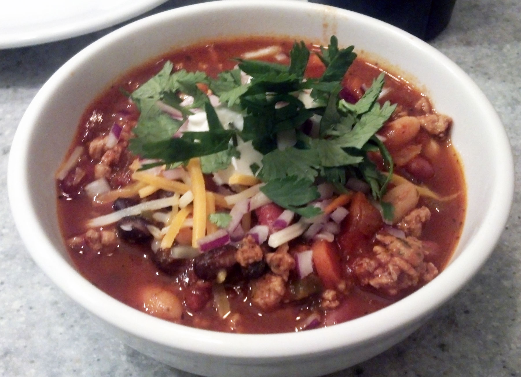 When temperatures dip, this hearty and healthy chili will hit the spot. The funny thing about this recipe is that I totally had to make up for the fact that I had less than a teaspoon of chili powder. We usually have plenty of chili powder but we were just out, so all the dry ingredients went in to make up. I think it worked out VERY well. This chili is going on our regular rotation; we don’t even miss the beef.