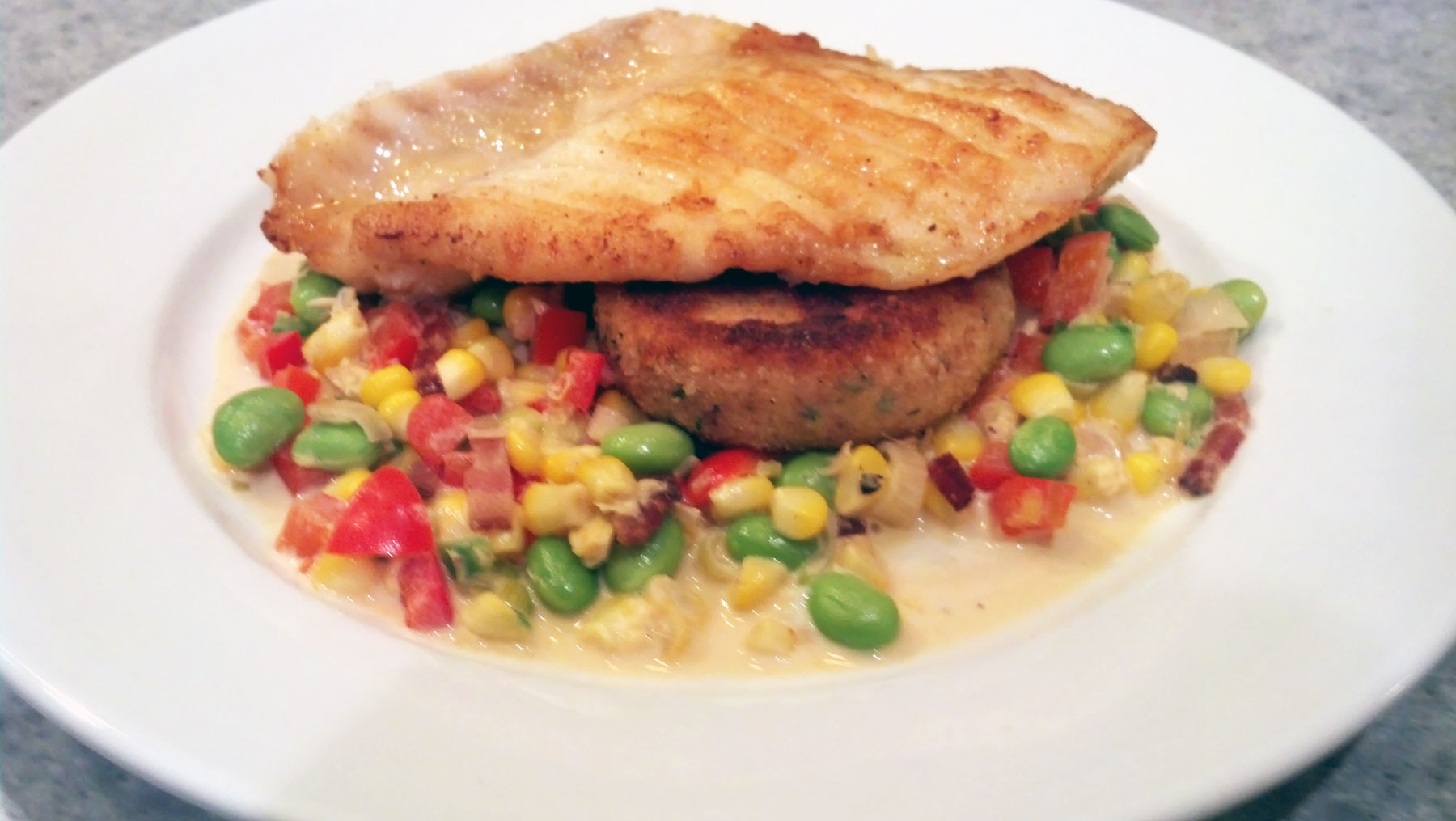 Light and refreshing, this meal has it all. Triggerfish has become very trendy at least here in the south. It has a meaty consistency that holds together well whether you grill it or sauté it as I did. It has some of the richness you get from Sea Bass but not as oily. And of course my succotash which I’ve made a million times and posted once here. Each time I make the succotash it will vary depending on what is fresh. This time I used edamame and green garlic. Whenever I need to add a little crunch and starch, I go to grits (or polenta). These polenta cakes are easy to make yourself or you can buy premade polenta to speed the process up. I’ve also posted them several times here, here and here.