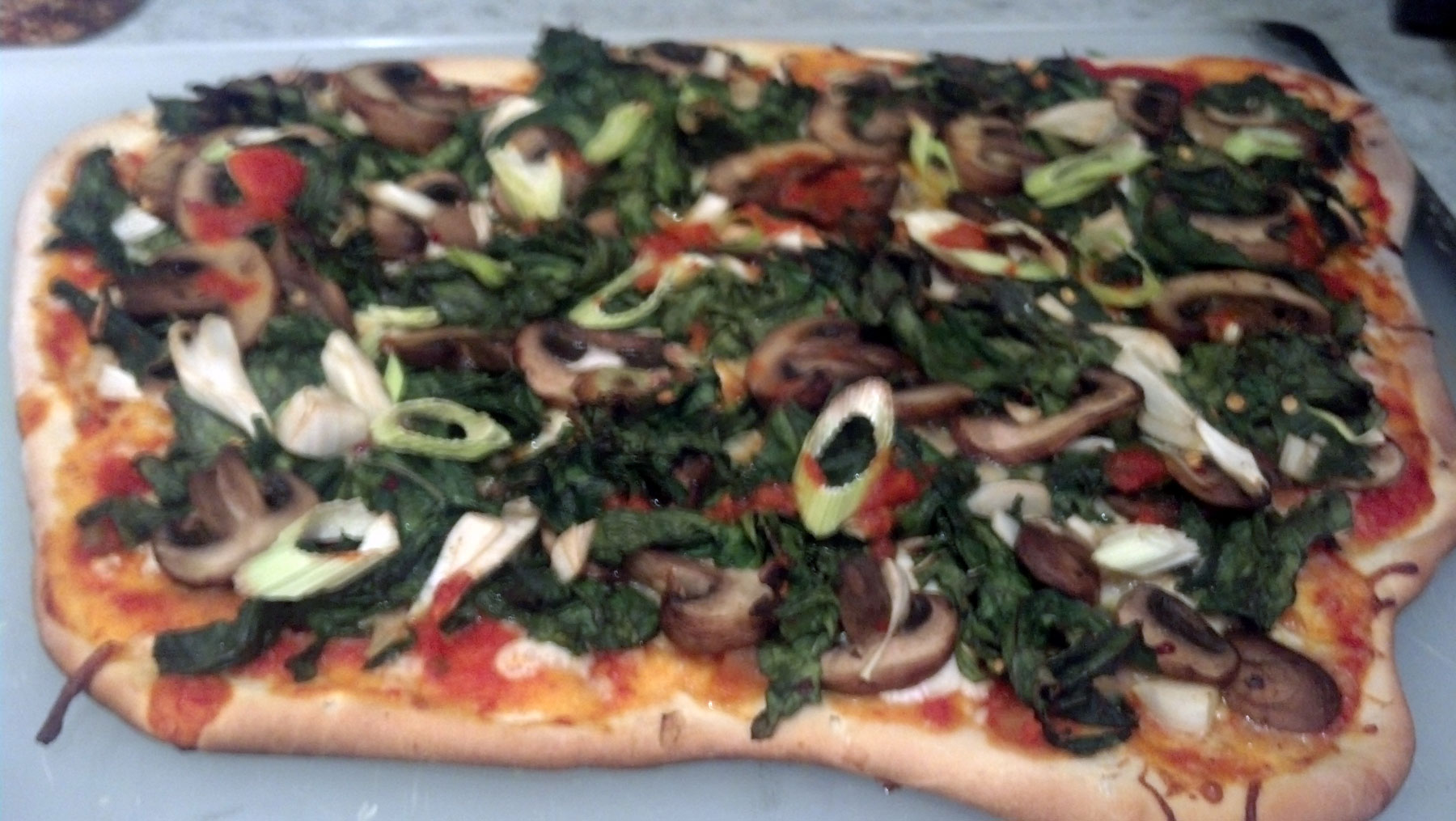 - Spread a thin layer of sauce on the pizza crust and sprinkle with crushed red pepper to taste. Add a thin layer the two cheeses (don’t add too much, be judicious). I like to add a few dollops of sauce in a few different places. Add the kale, garlic and mushroom mixture, spreading it evenly across the pizza.