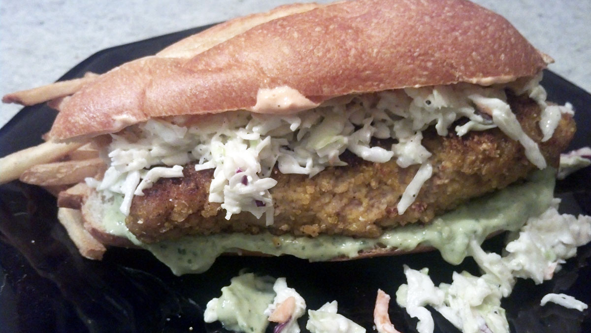 Amazing leftovers revisited. On a Sunday I made Cornmeal Crusted Catfish, Country Ham Succotash with Avocado and Cilantro Purée. On Tuesday I reused the catfish and the avocado purée to make a Catfish Po-boy, with Sriracha “Mayo” and Avocado and Cilantro spread, Bleu Cheese Coleslaw with Baked French Fries.