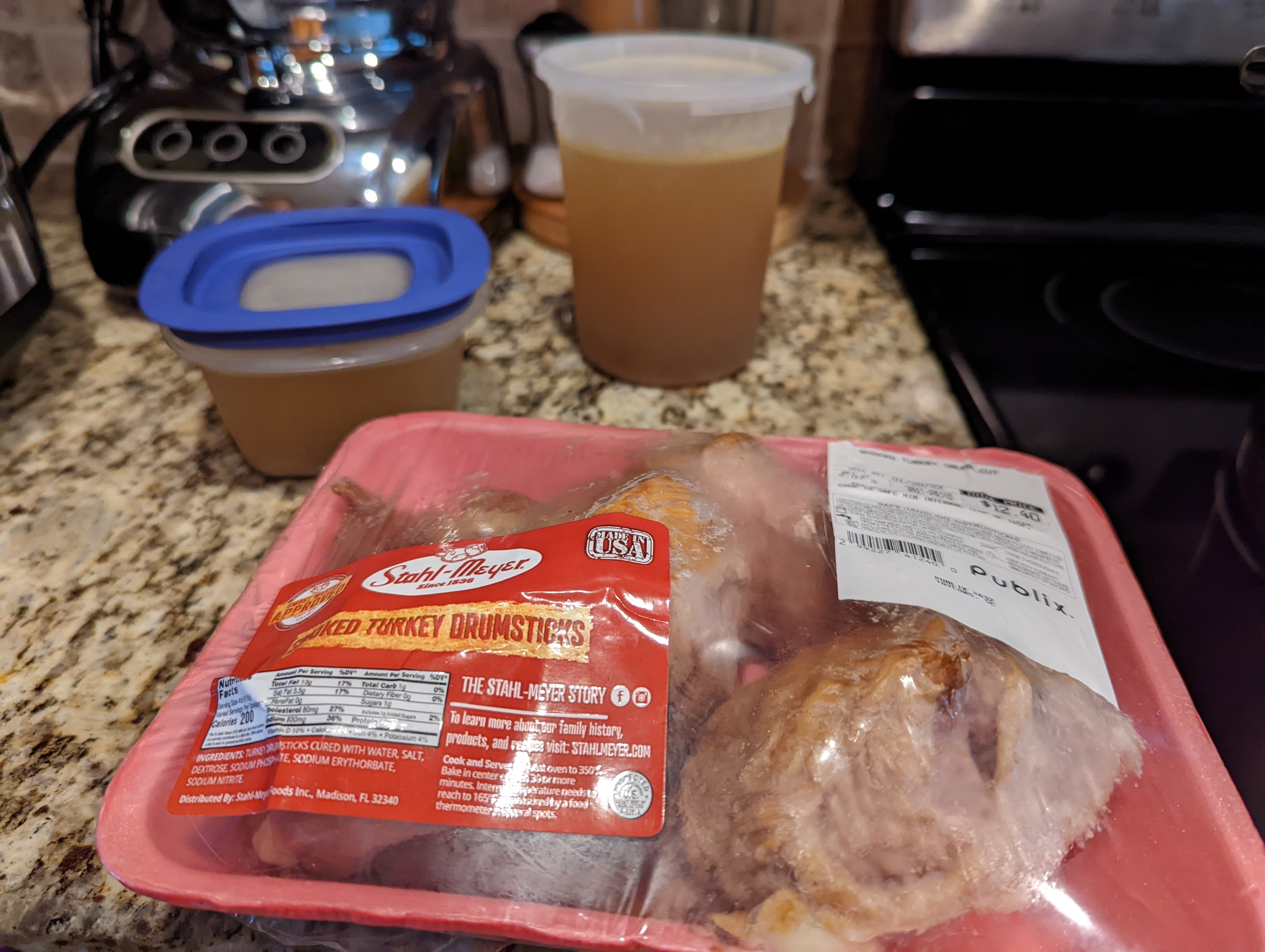 - Add the turkey stock and turkey drum sticks. Bring to a boil then reduce to a simmer. Cook for 30 minutes.