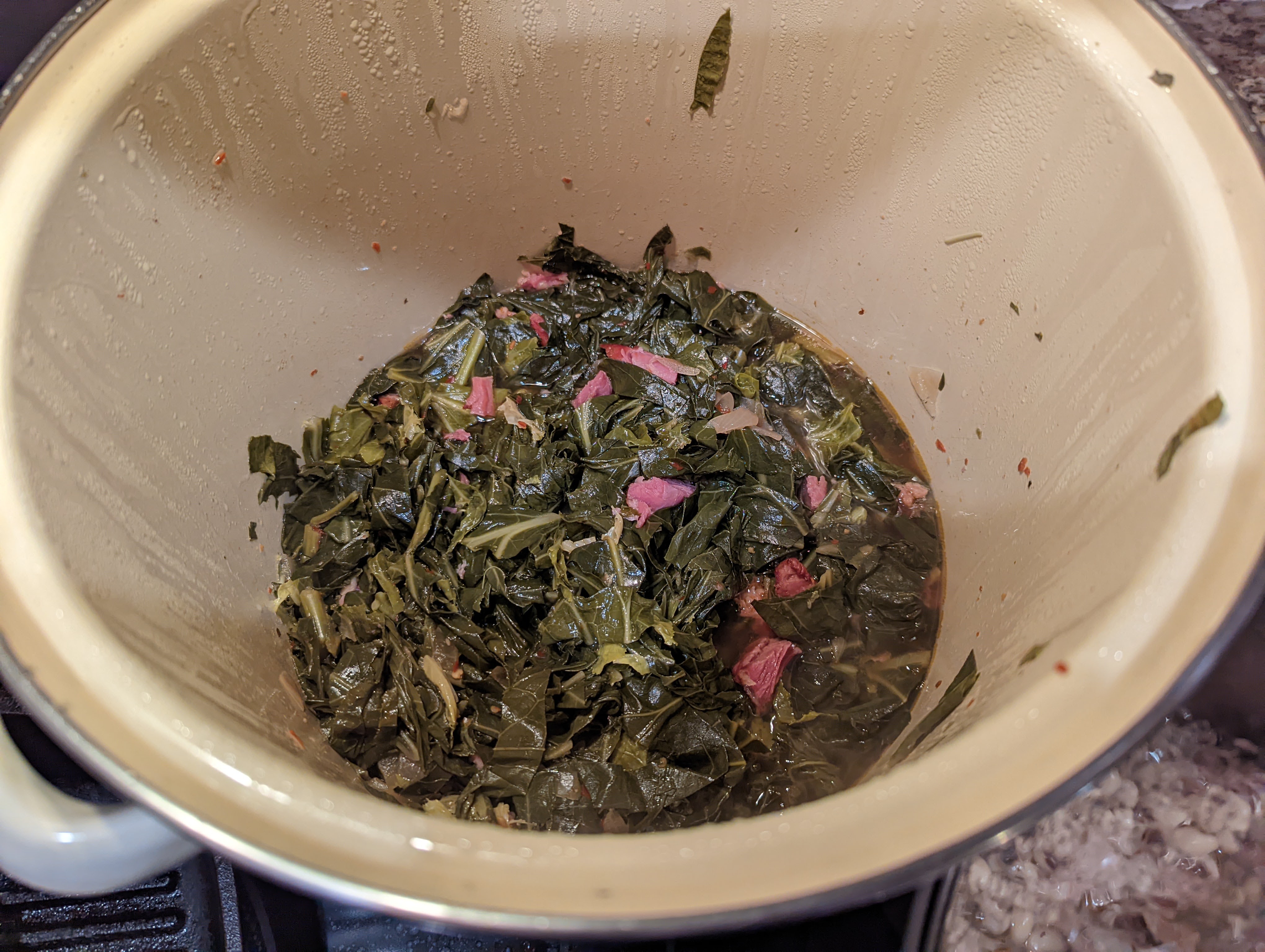 This year I added smoked turkey drumsticks to the collards as well as more sweet and more heat. They turned out just about perfect.