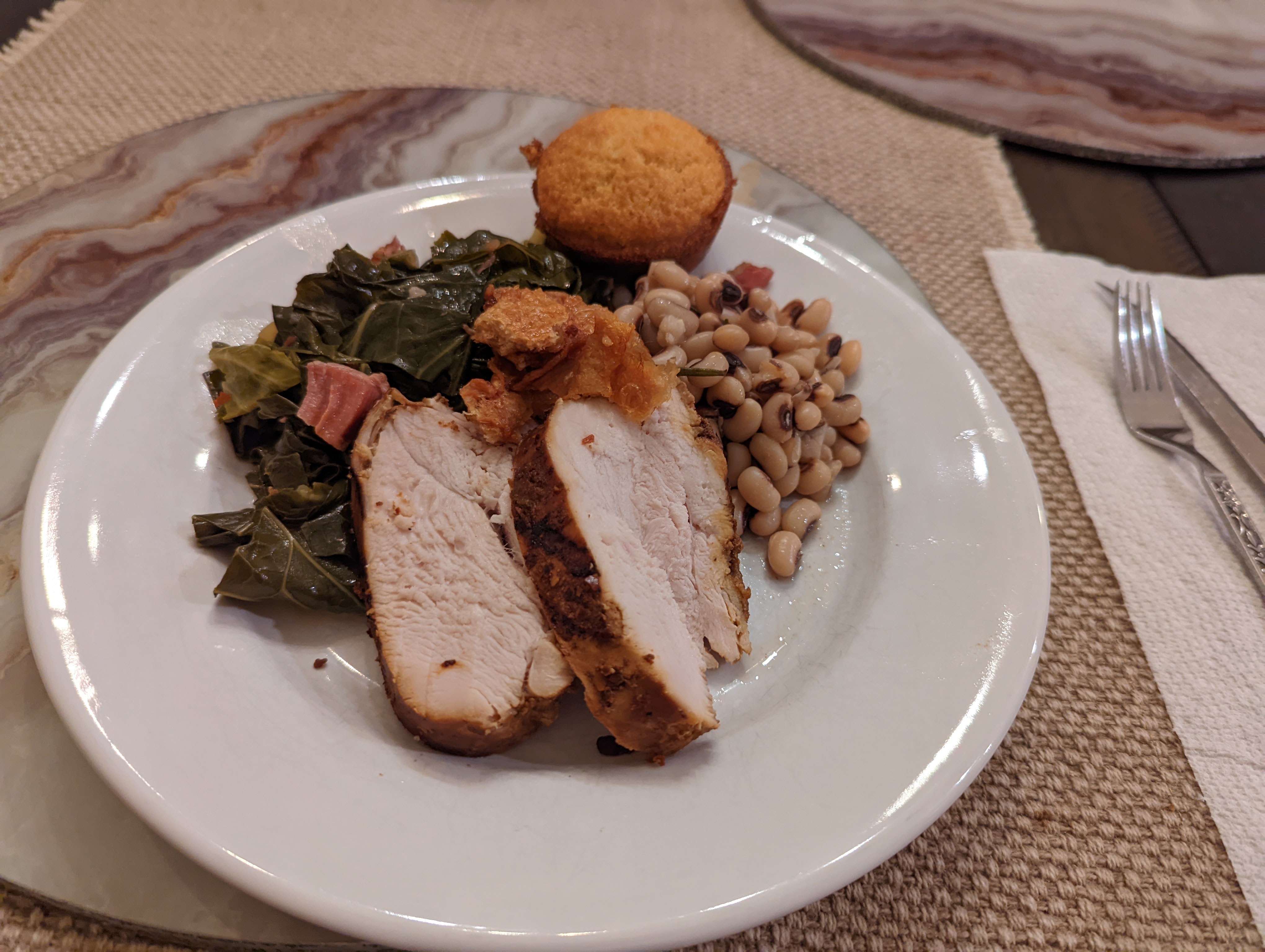 I’ve post this recipe five years ago (Sous Vide “Smoked” Turkey, Black-Eyed Peas, Collard Greens and Cornbread with Turkey Skin Chips) and again last year (Southern New Year’s Day – “Smoked” Sous Vide Turkey, Field Peas, Sweet and Spicy Collard Greens, Crispy Turkey Skin Chips with Jalapeno Cheddar Cheese Cornbread). They were both very, very good. I won’t include the whole back story of why I originally posted but here is the why we southerners eat greens and peas at New Year’s.