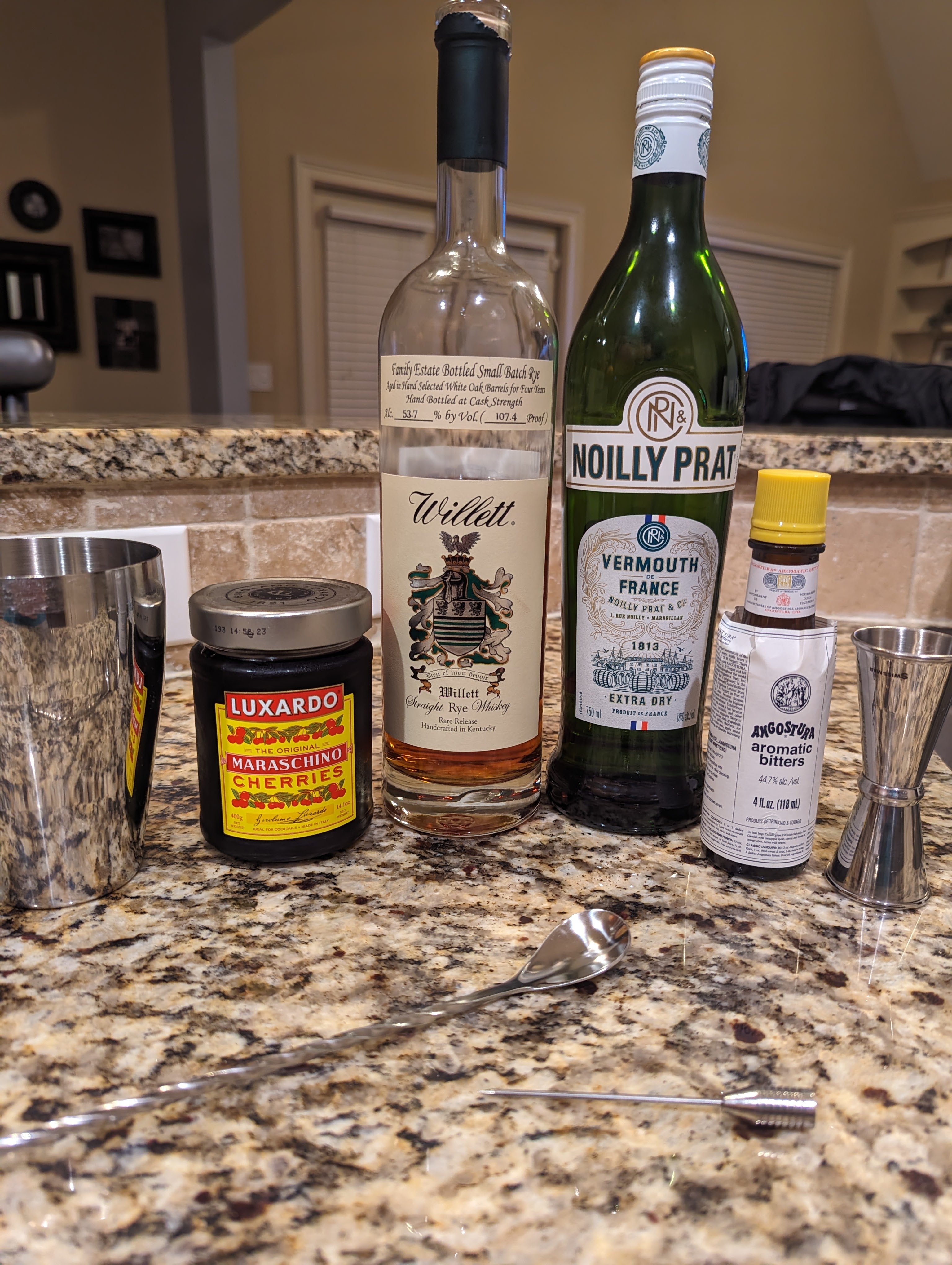 - Add all ingredients to a mixing glass: rye whiskey, dry vermouth, bitters and some cherry juice from the Luxardo.