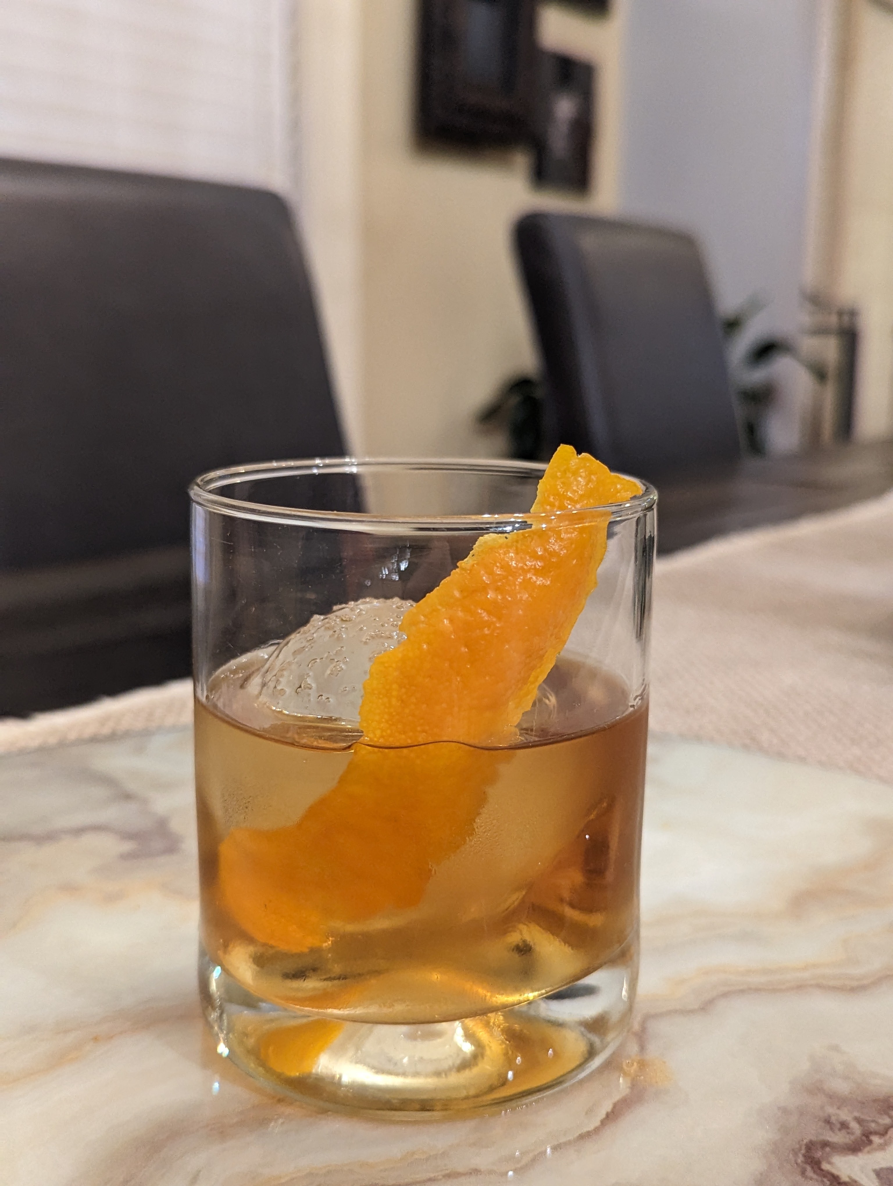 - Pour mixture into an Old Fashioned glass. Express and garnish with an orange twist.