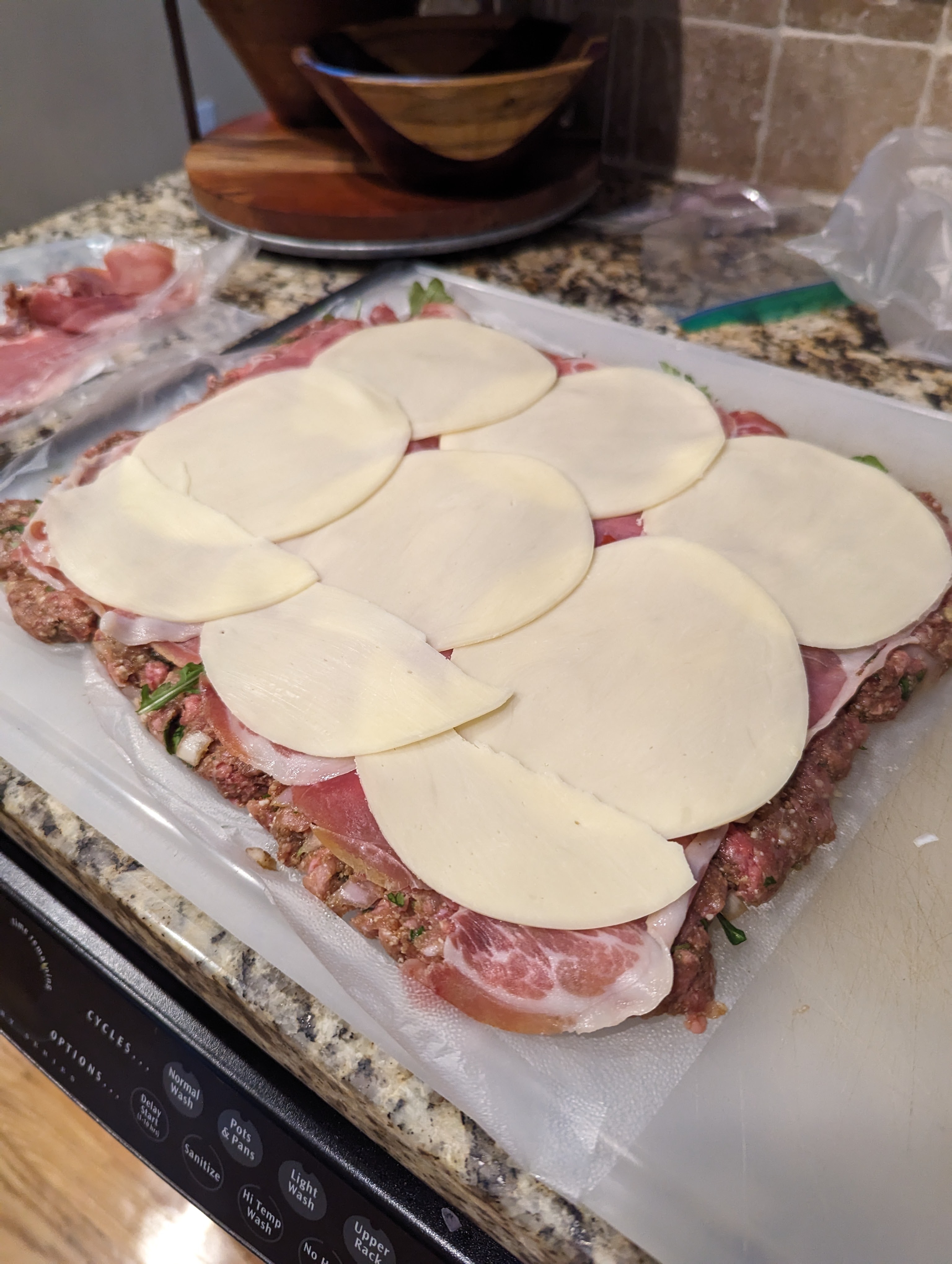 - Add the arugula, prosciutto and provolone evenly across the meat mixture.