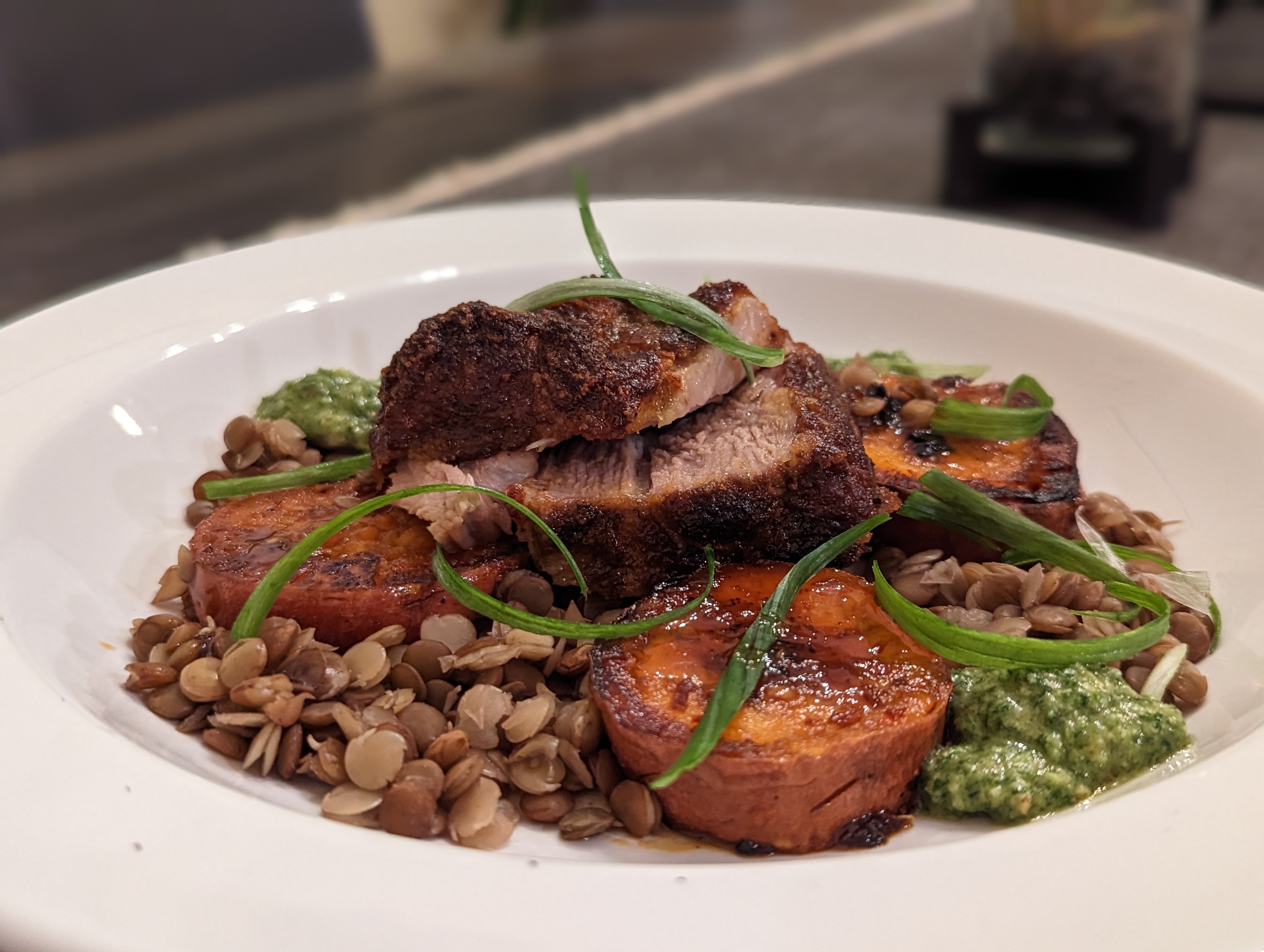 The rub on the pork is smoky, sweet, salty with a little heat. Sweet potatoes with the glaze add sweet starch and just a little crunch. The green lentils are very earthy. The pesto adds an herbaceous pop of both color and flavor. I garnished with thinly sliced, rinsed and dried green onions which also gave a nice color.