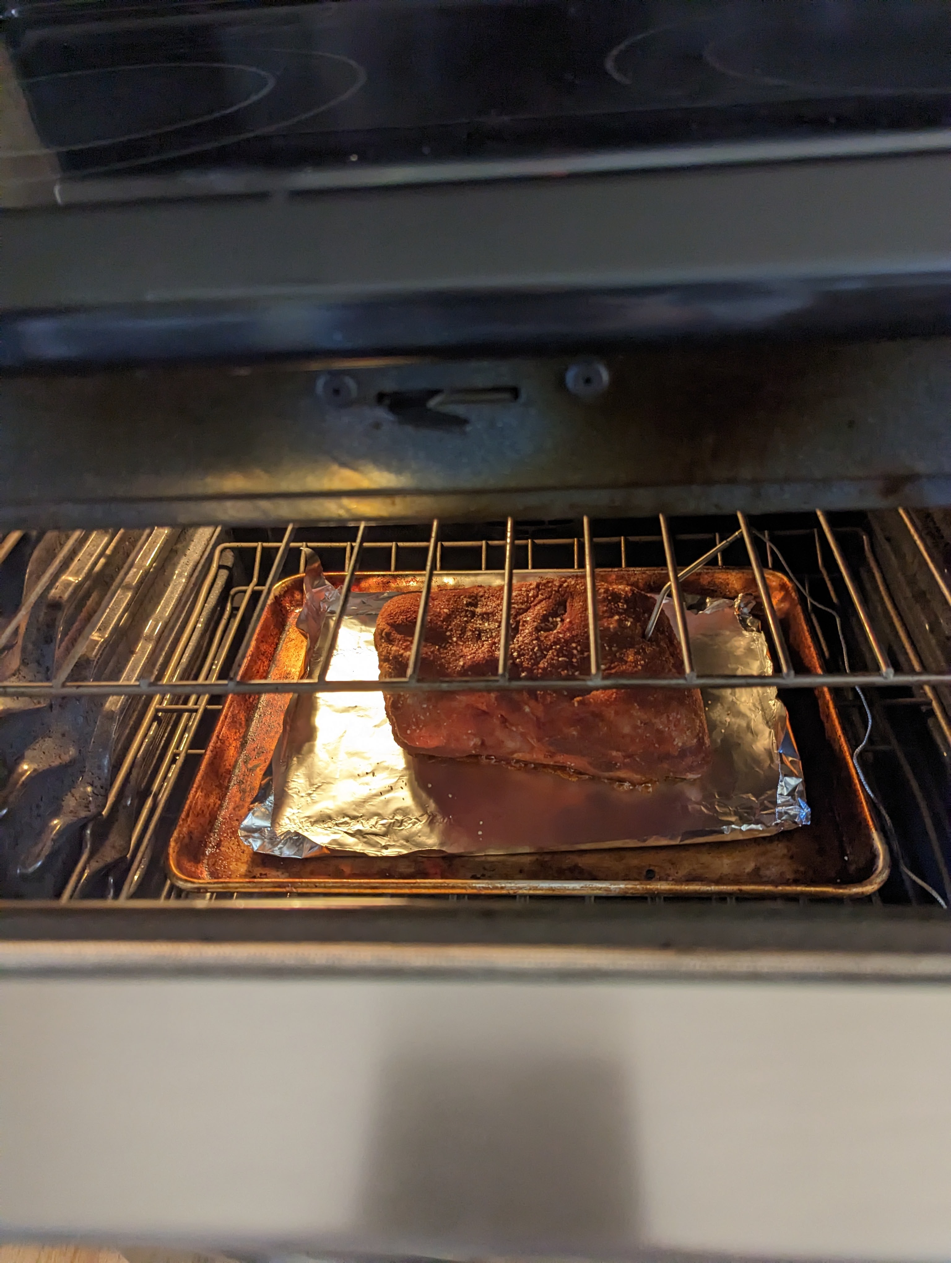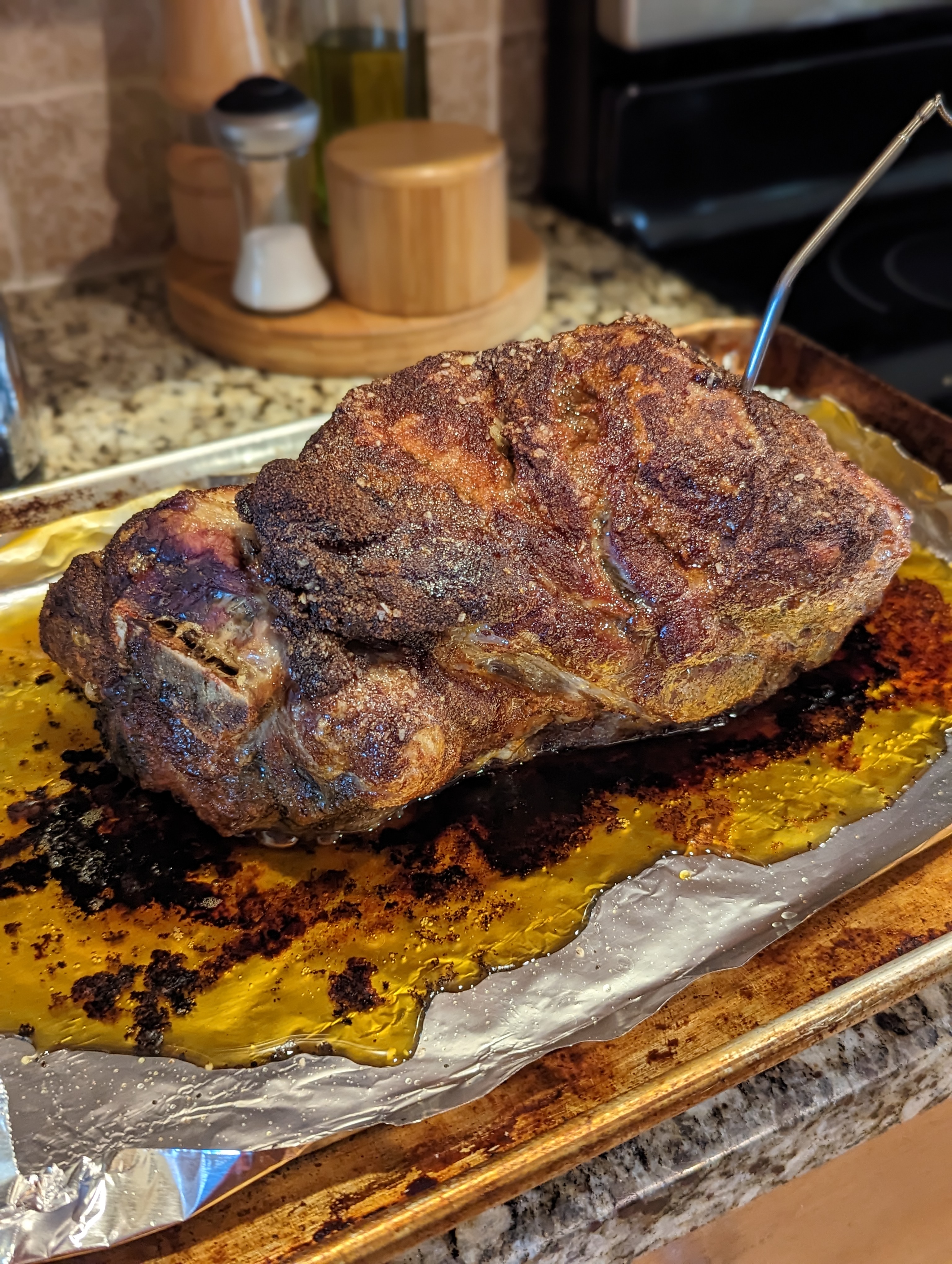 - Reduce the heat to 325° F and continue to cook until internal temperature is approximately 175° F, about 2-4 hours. Remove the pork from the oven and let stand until cool enough to handle, about 30 minutes.