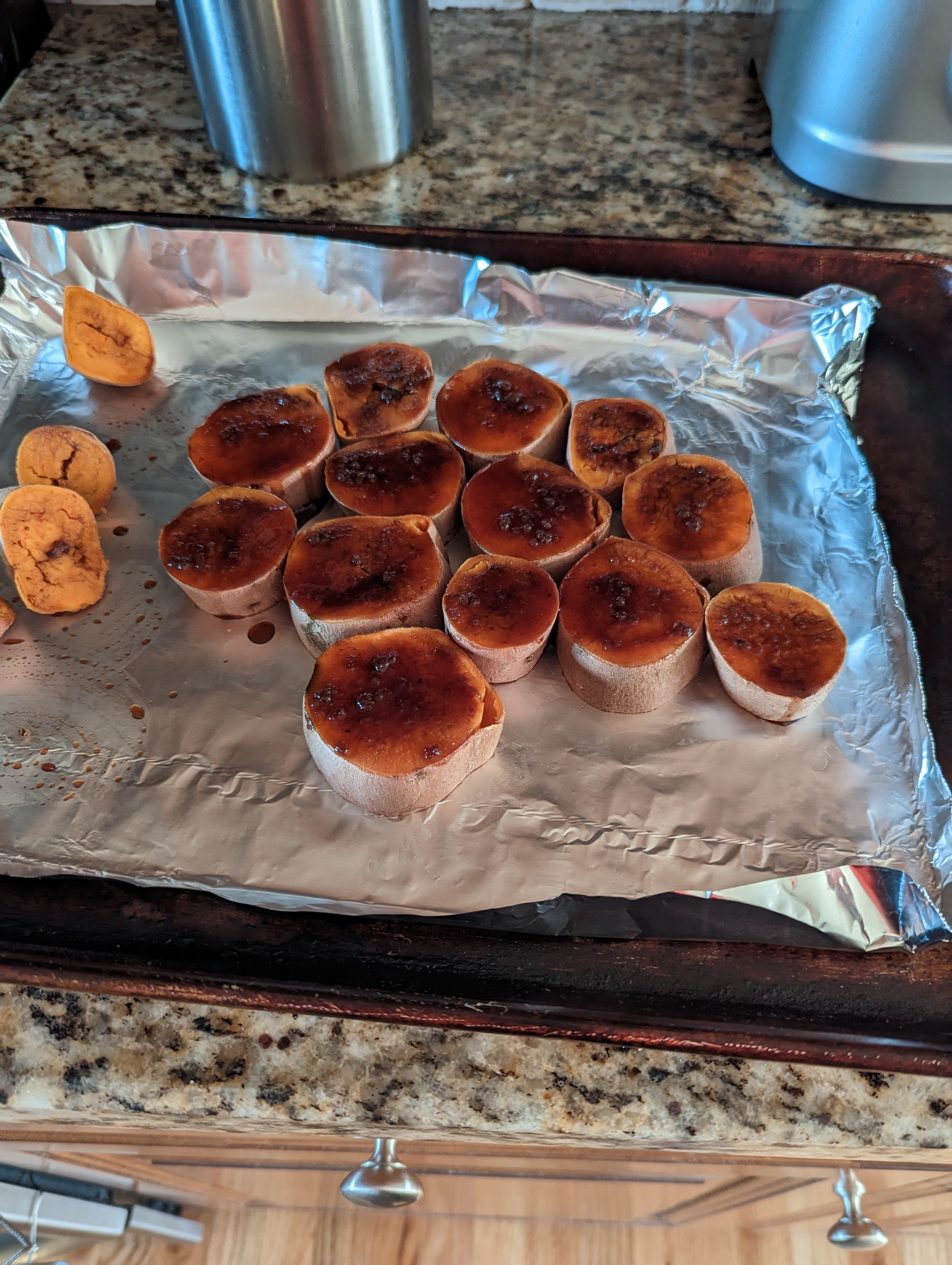 - Set your oven to broiler and place the sheet pan in the middle rack under the broiler. As the sweet potatoes start to brown, remove the sheet pan and re-dress with the soy mixture.