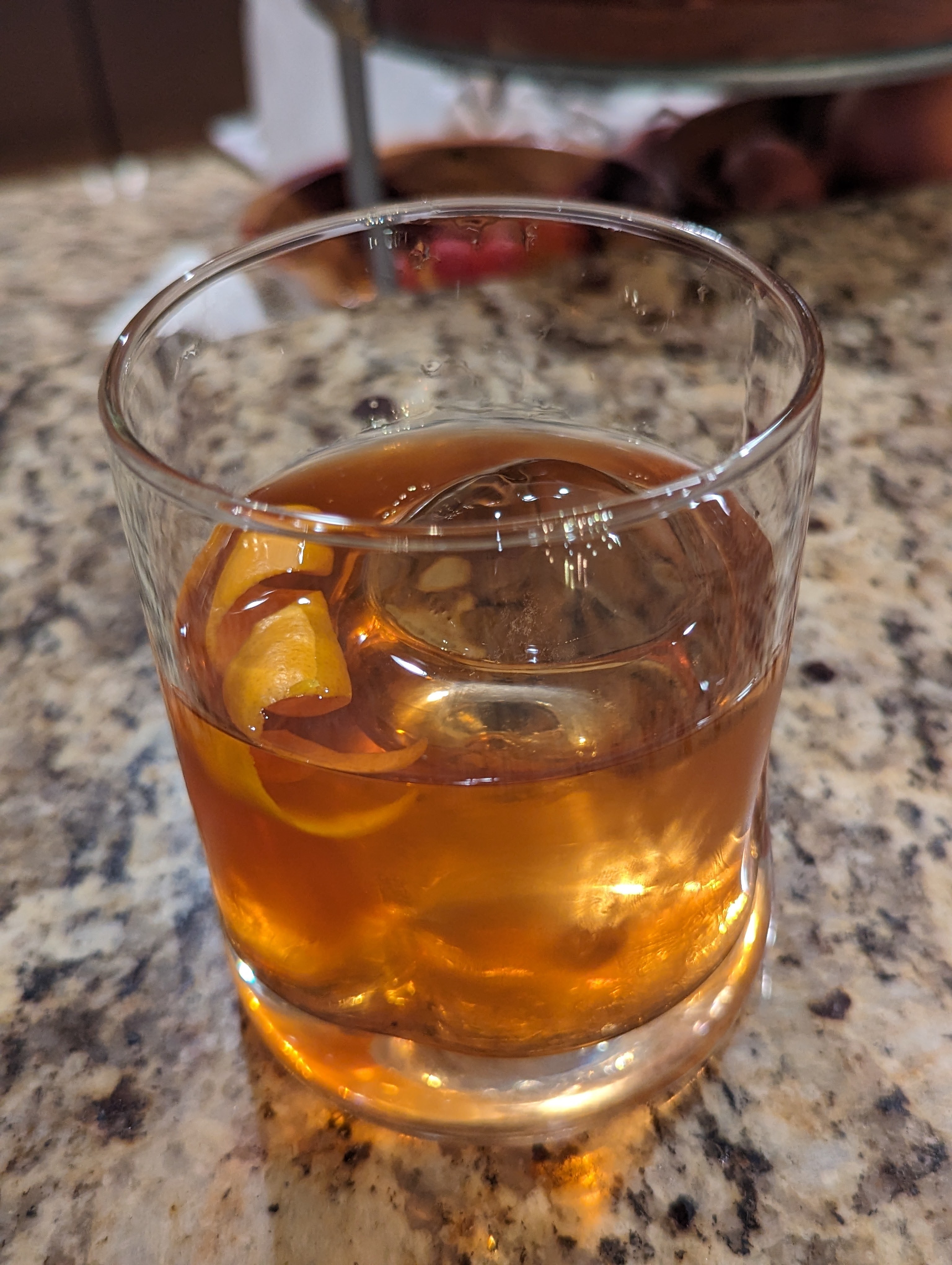 - Pour over chunked or ice sphere in a old fashioned glass. Garnish with lemon twist.