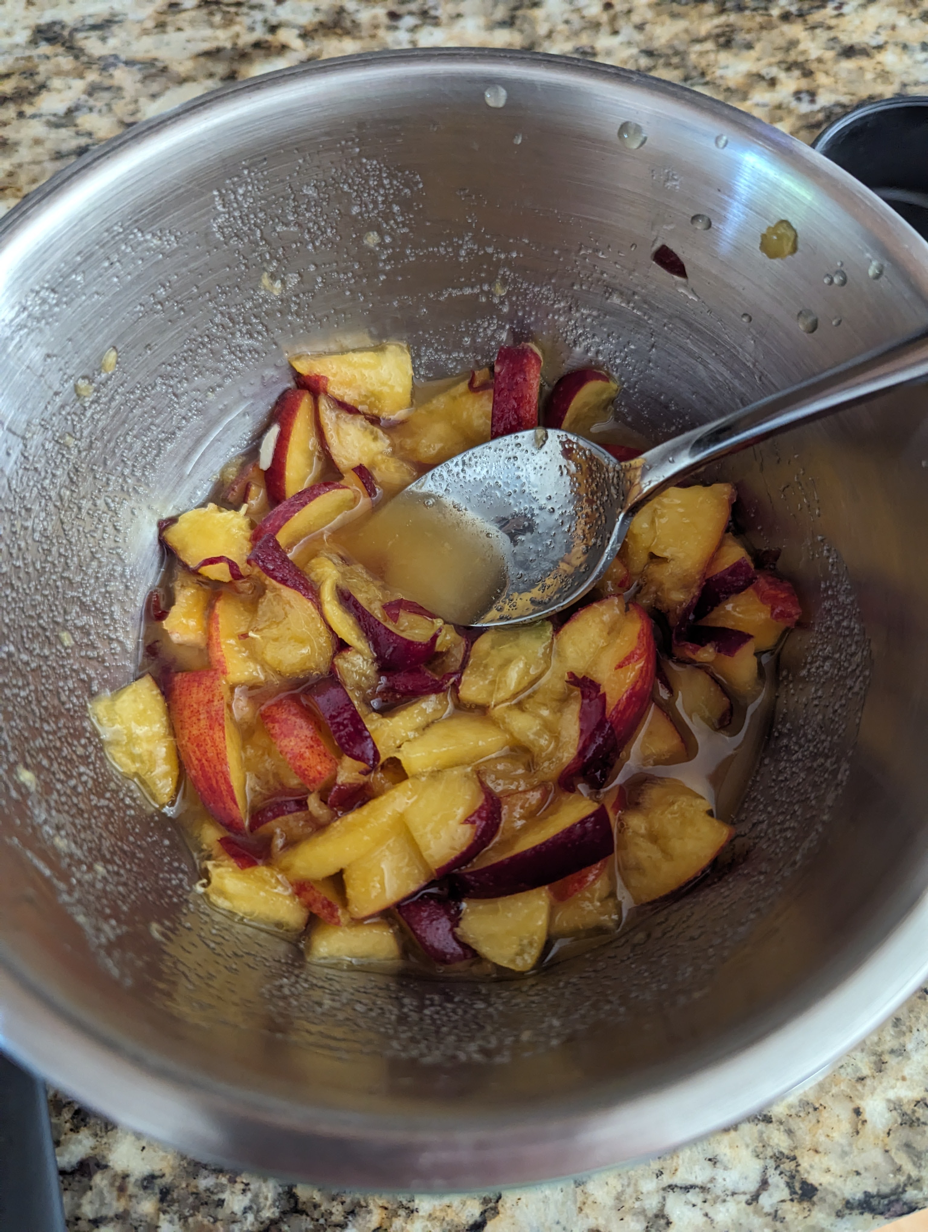 - Strain out the macerating liquid and preserve. I made a Peach Simple Syrup out of it. See below.