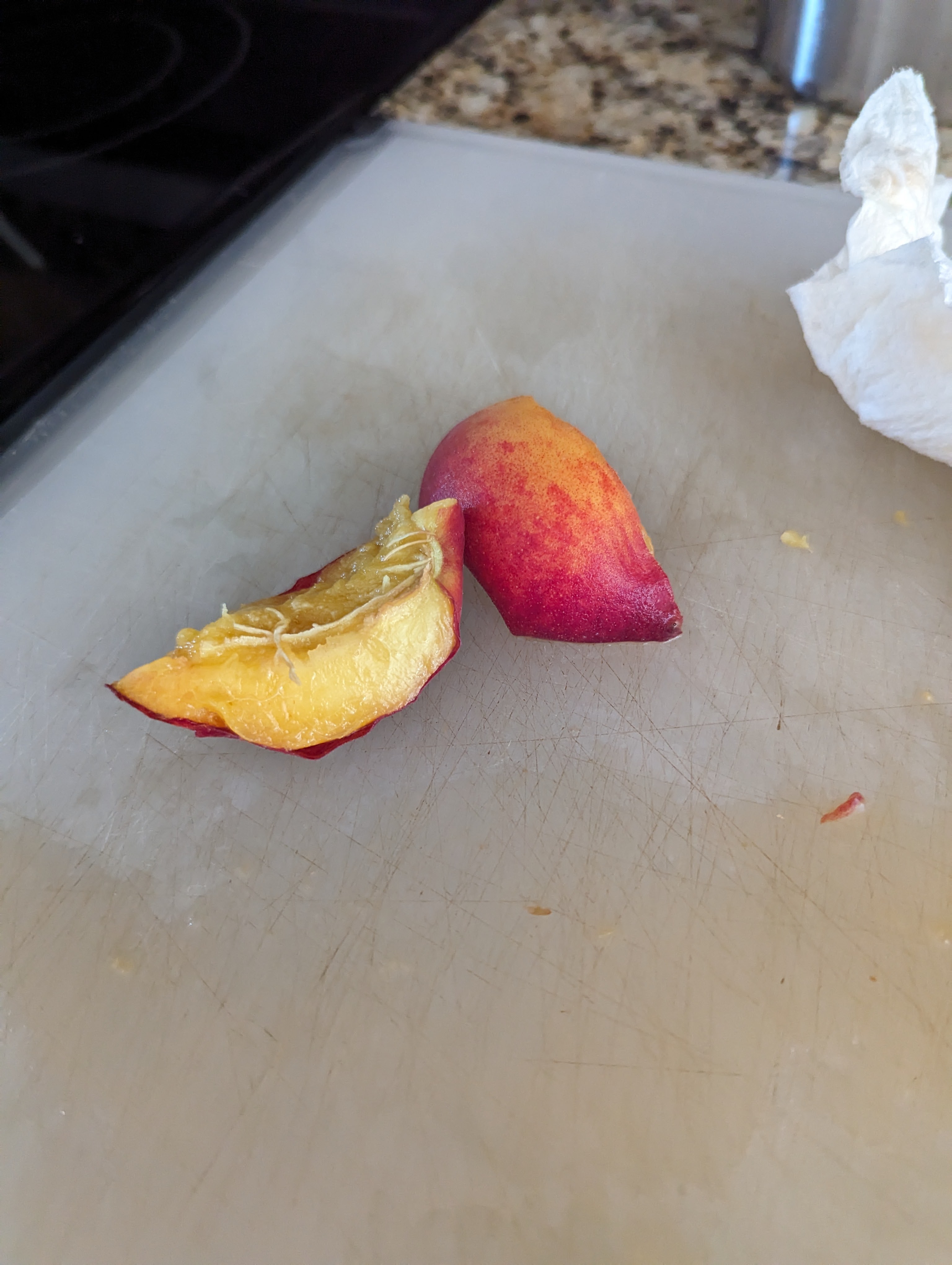This recipe is an exact copy of my Local Strawberry Ice Cream except I replace the strawberries with South Carolina peaches. The strawberry version was liked better than this version by my boss wife. I think if I made this again I might peel the peaches that I macerate. While I liked the texture of the skins, I think my wife did not. Here are some other ice cream recipes I’ve posted and some coming since I purchase the ice cream attachment for my KitchenAid mixer. The last one I made before I bought the attachment and my wife was limiting lactose and gluten.