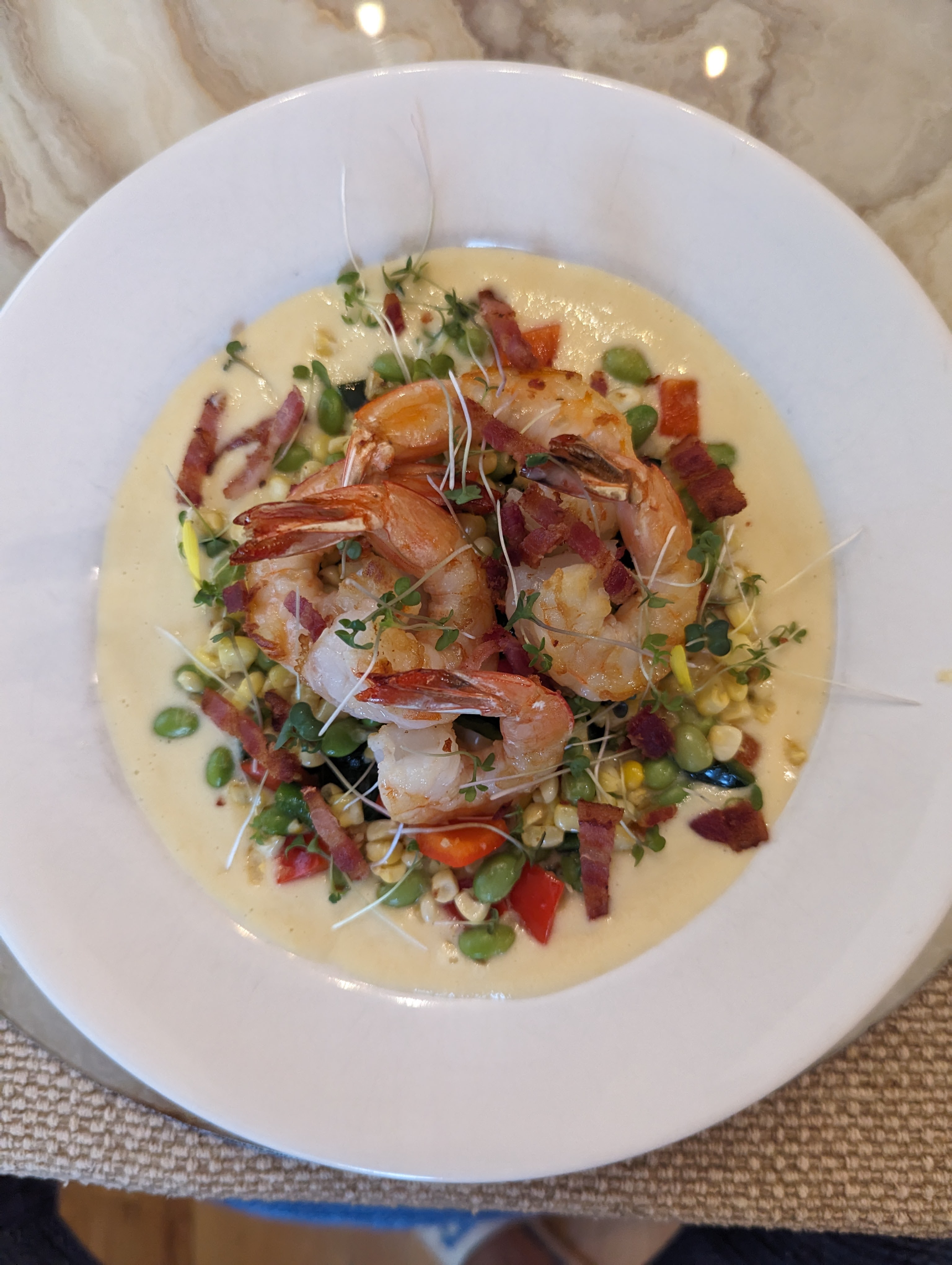 - Add some of the succotash, top with shrimp and garnish with bacon and micro greens if you can find them.