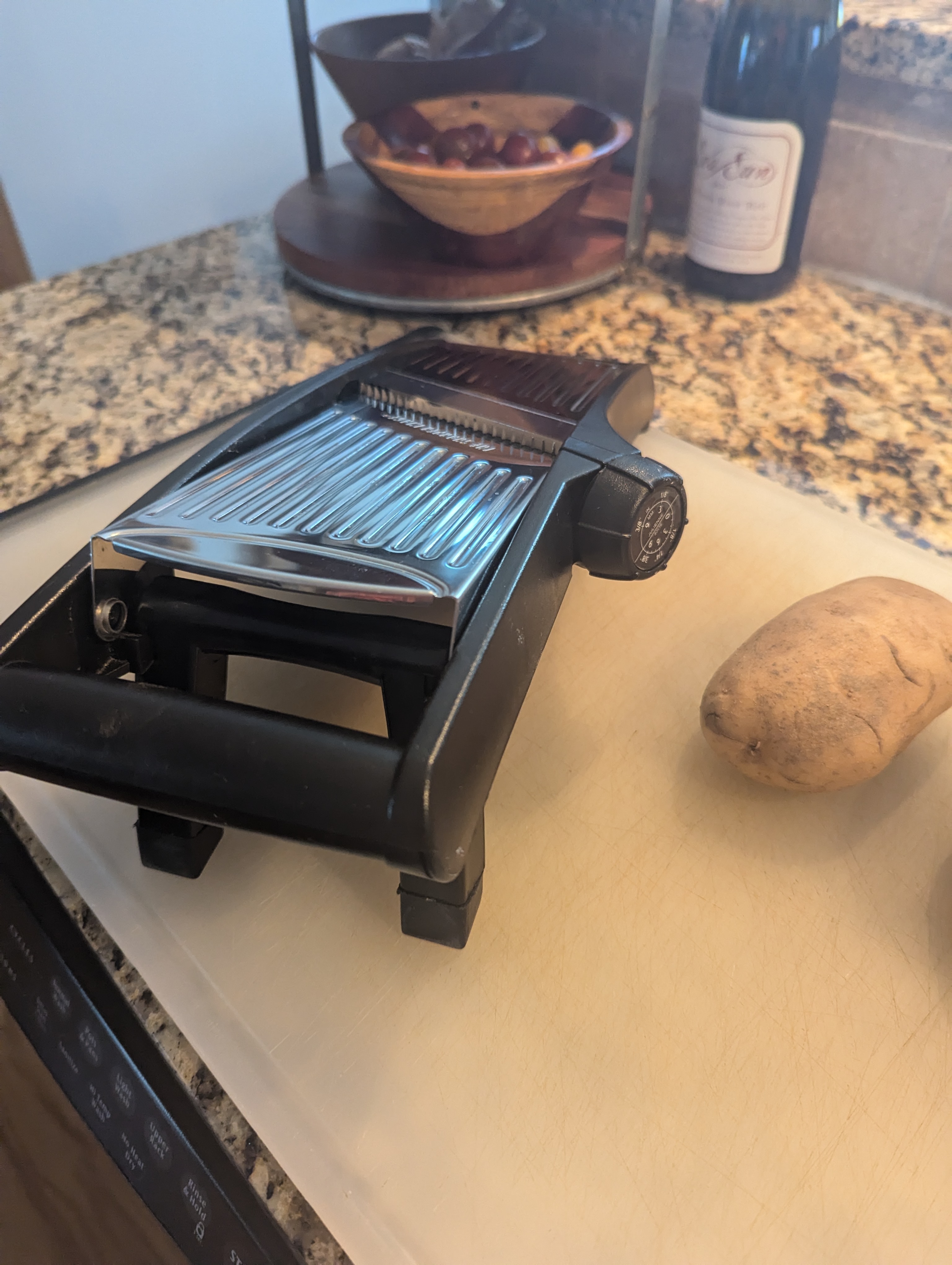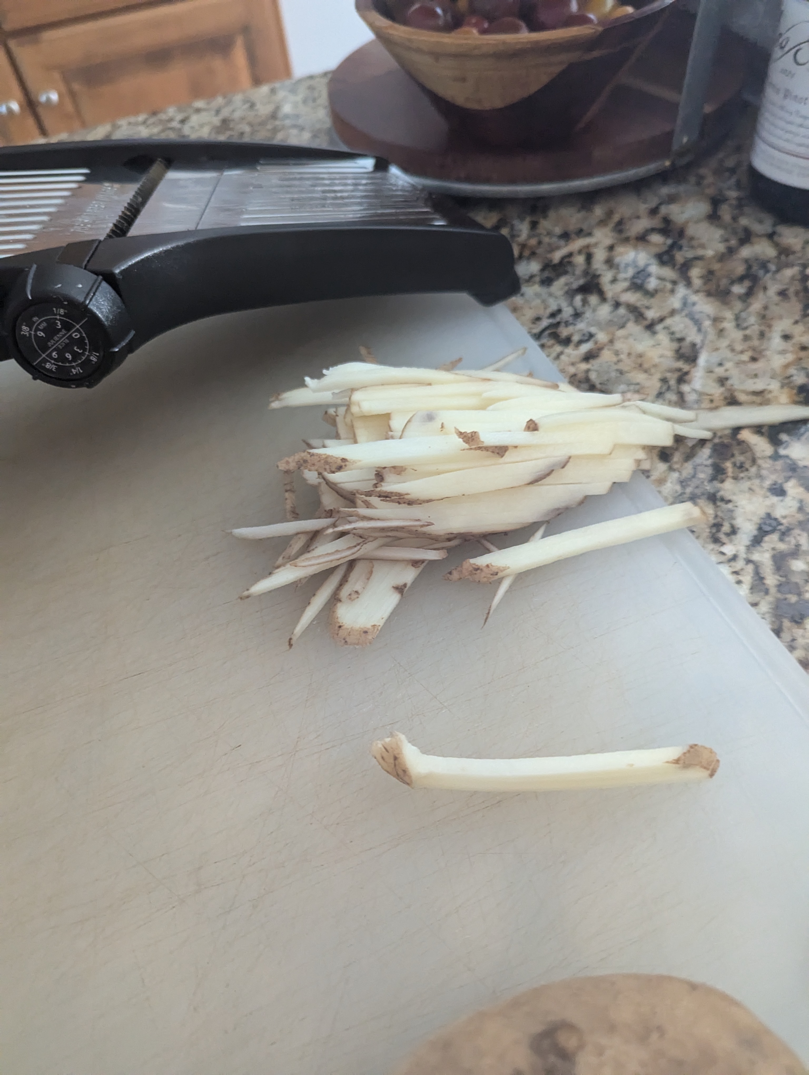 - Using the mandolin slicer, on the small fries setting, carefully slice potatoes. I use a cut proof glove.