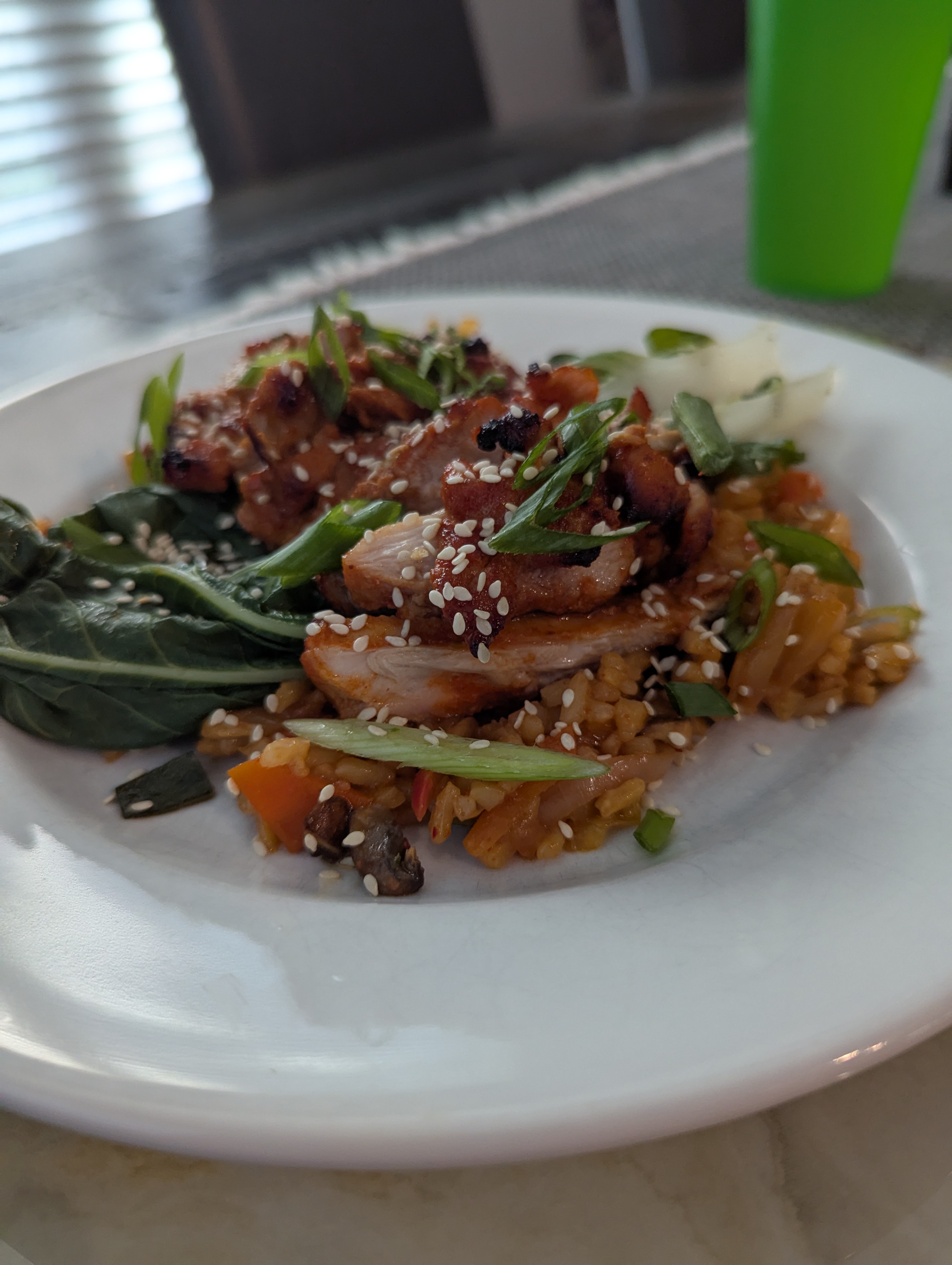 How to plate Air Fried Korean Chicken Thighs, Steamed Bok Choy and Kimchi Carolina Gold Fried Rice