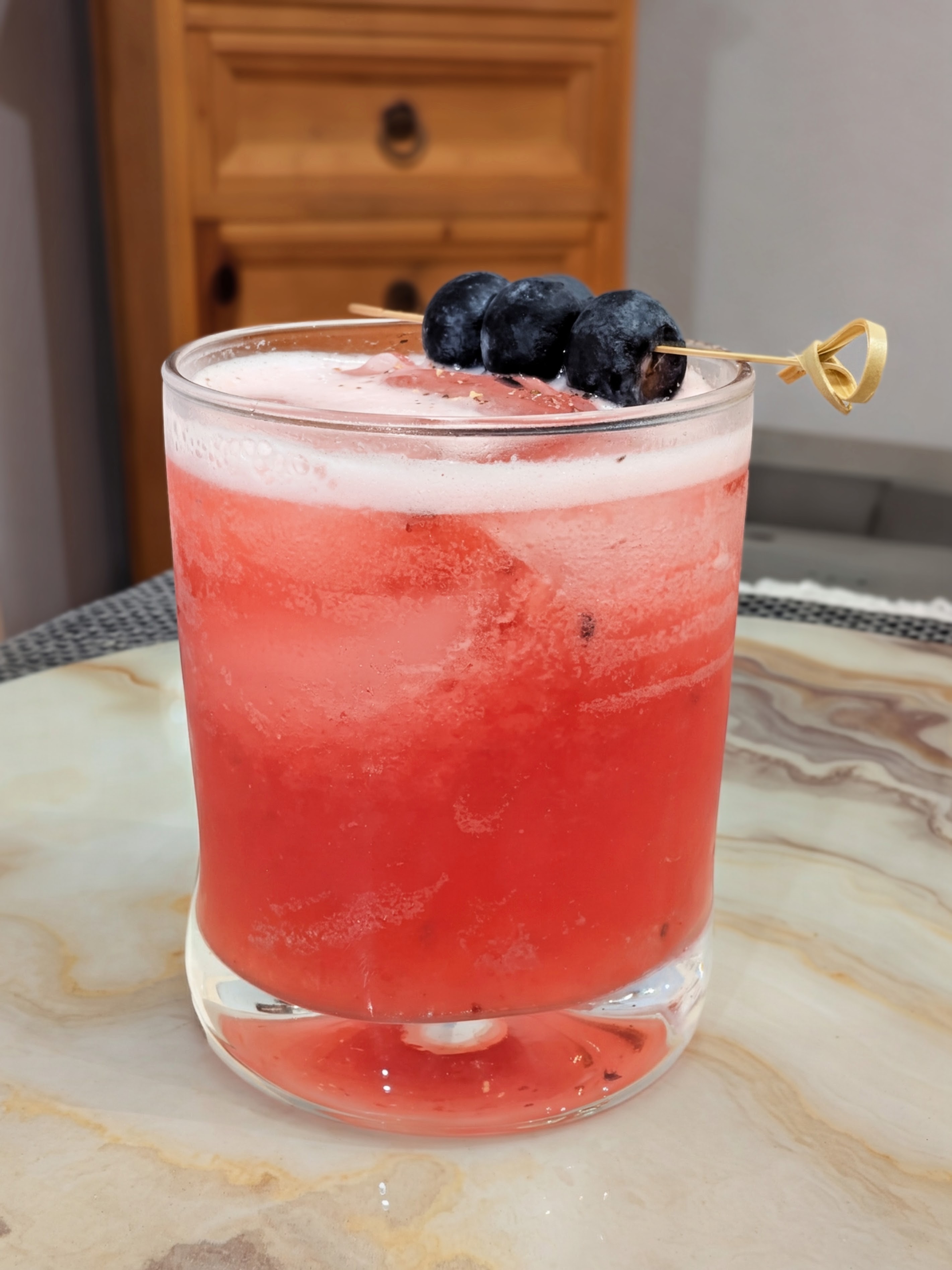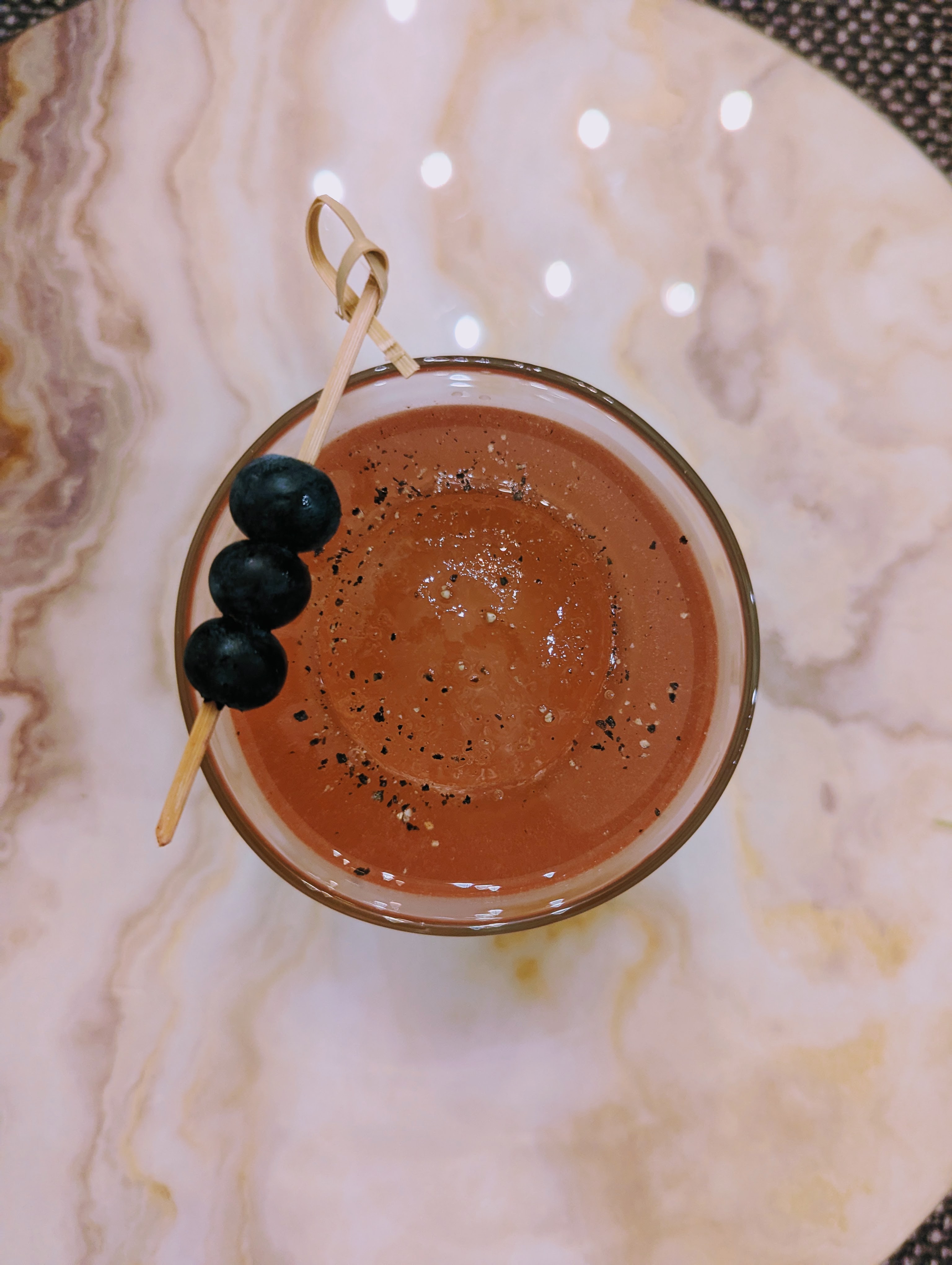 - Garnish with 3 blueberries skewered on a cocktail pick and a light crack of fresh black pepper over the top.