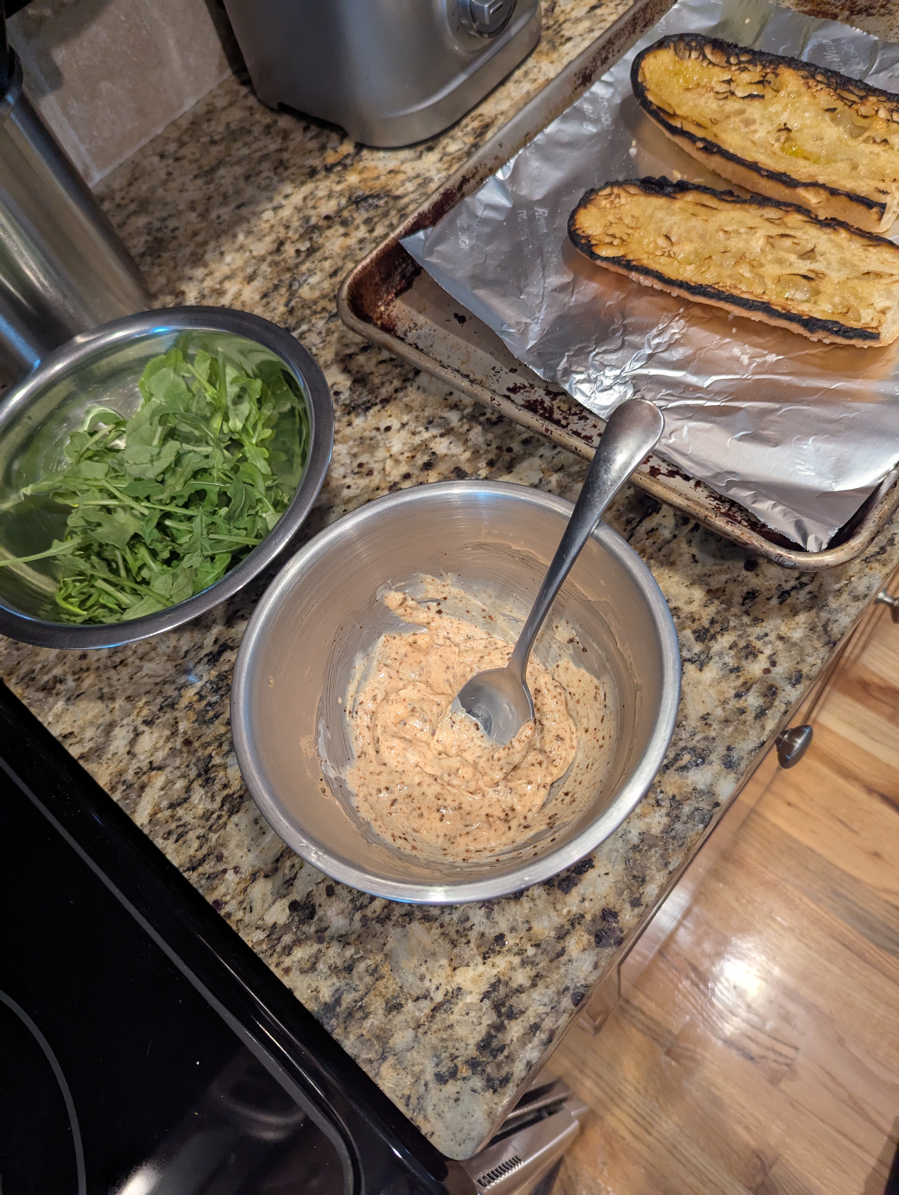 Grill or place slices of rustic bread (like stecca) under the broiler to char. Slather with the Aleppo-truffle aioli and serve alongside. - Enjoy!