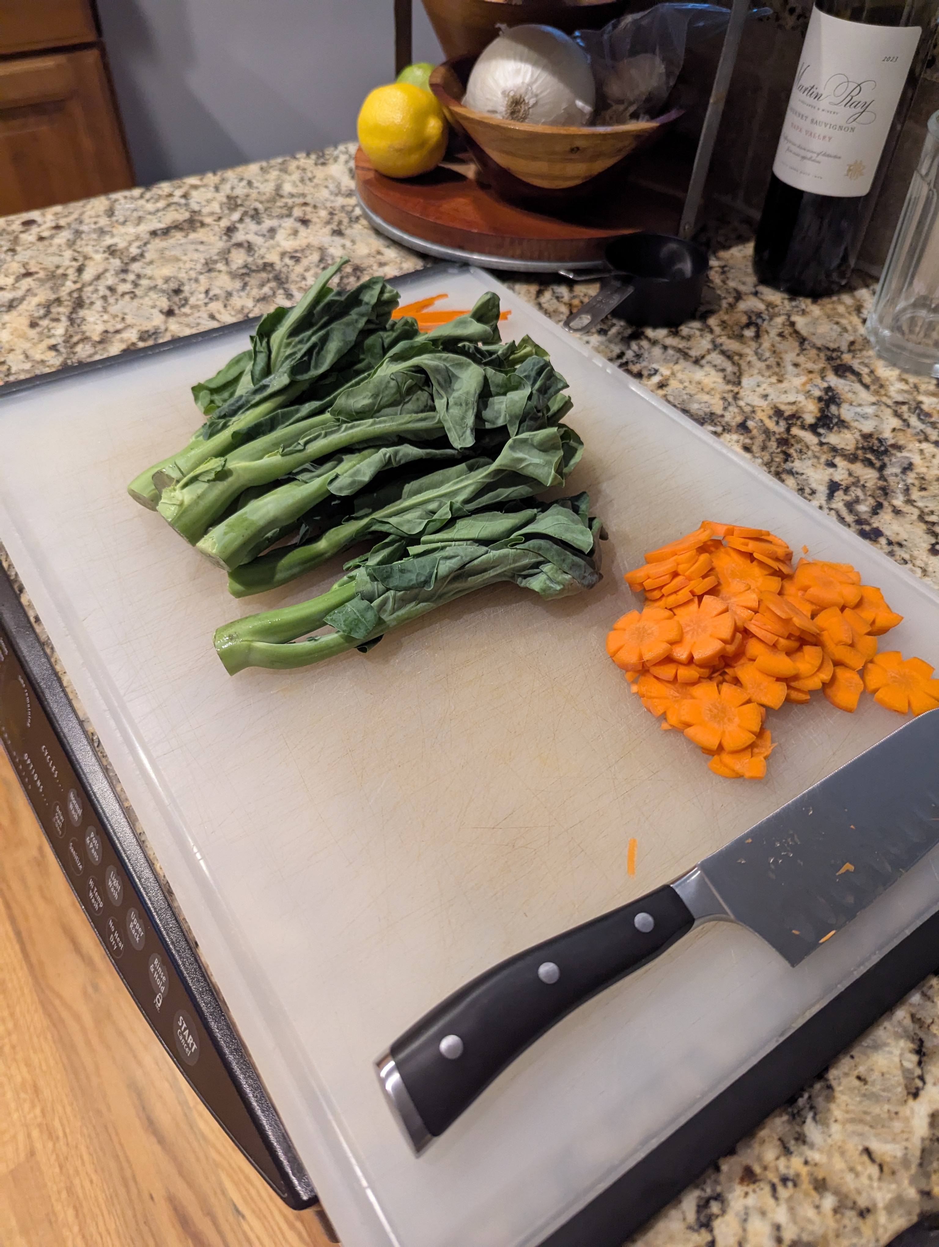 - 4 stems Chinese broccoli (gai lan), trimmed and sliced (separate stems and leaves)