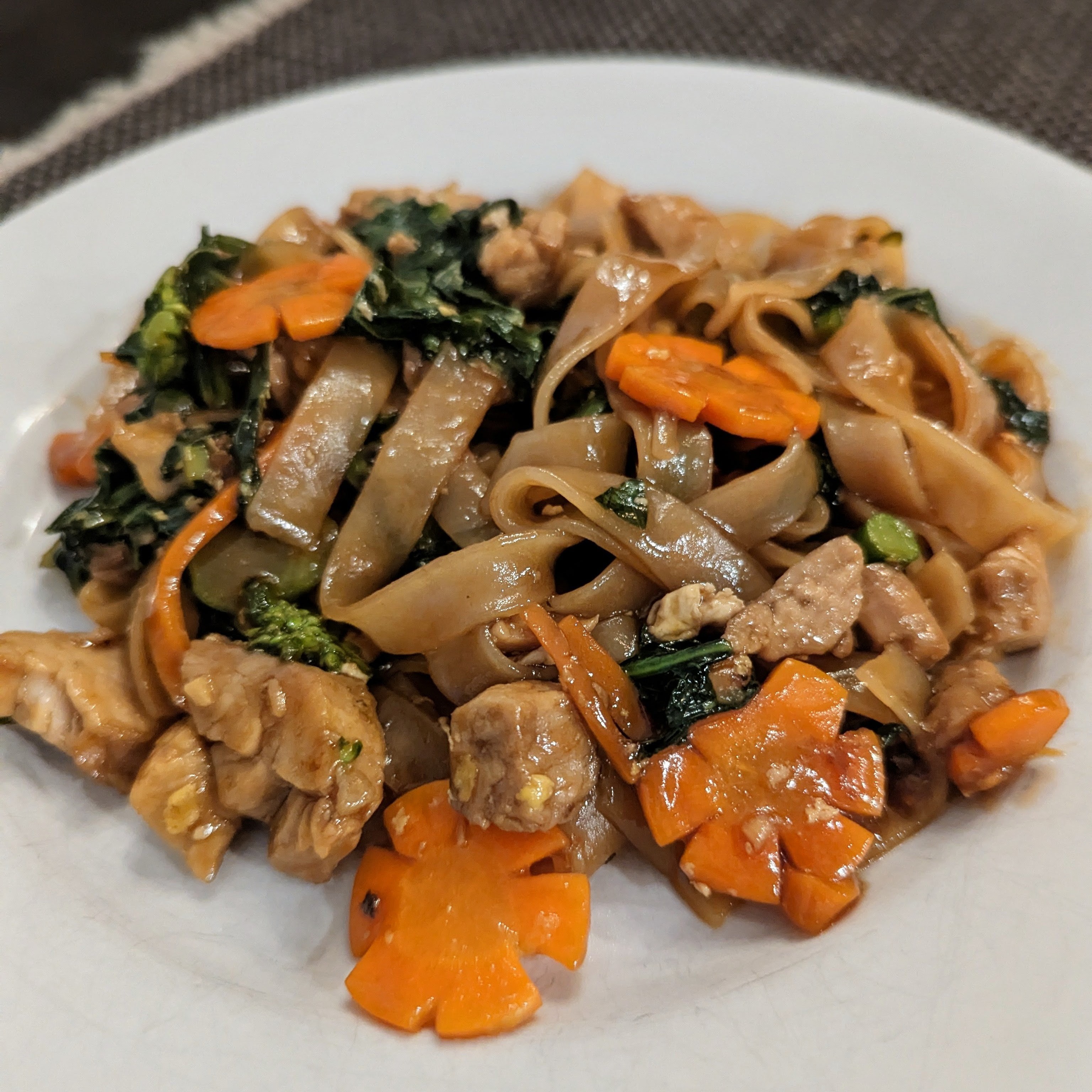 Pad See Ew (pronounced PAD SEE-ew, with the “ew” sounding more like the “oo” in food or moon) translates to “fried with soy sauce.” It’s one of Thailand’s most popular street foods and one of my personal go-tos whenever I visit a little Thai restaurant near my office. My usual order? Chicken or pork with those wide, chewy noodles tossed in a savory soy-based sauce.