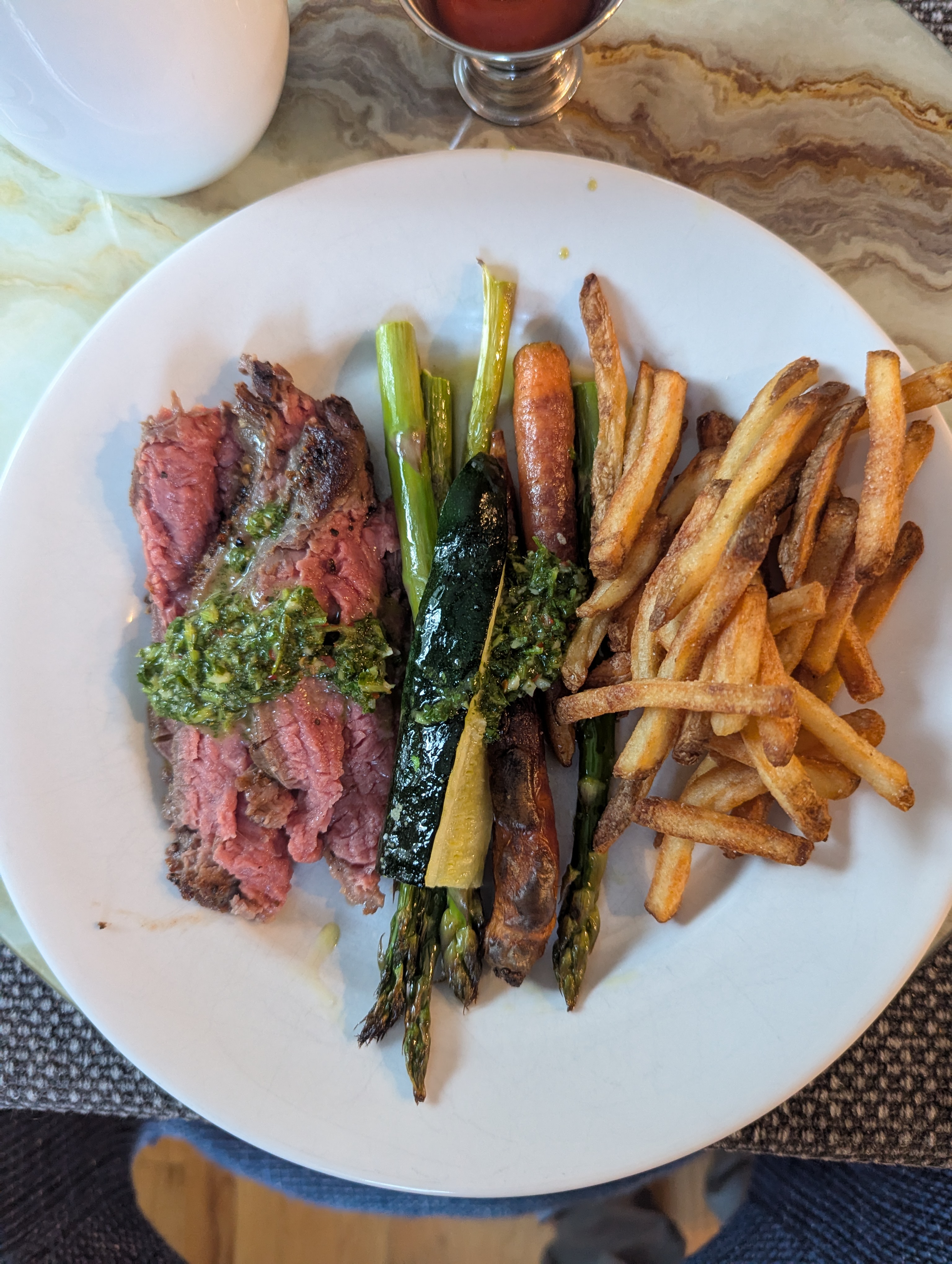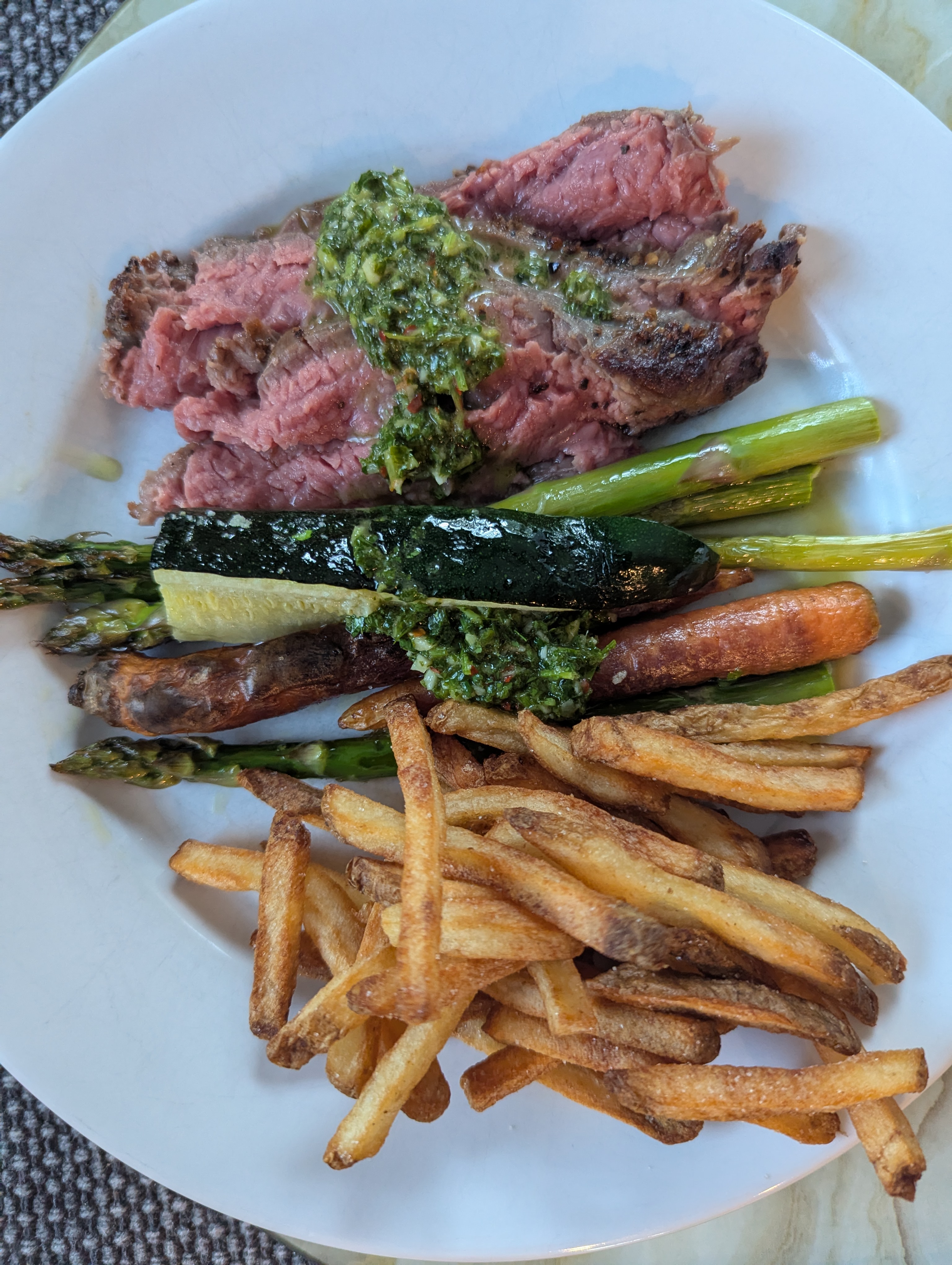 Steak frites is a meal on its own, but we like to add a side of vegetables. My choice? Asparagus, roasted under the broiler with a little olive oil, salt and pepper.