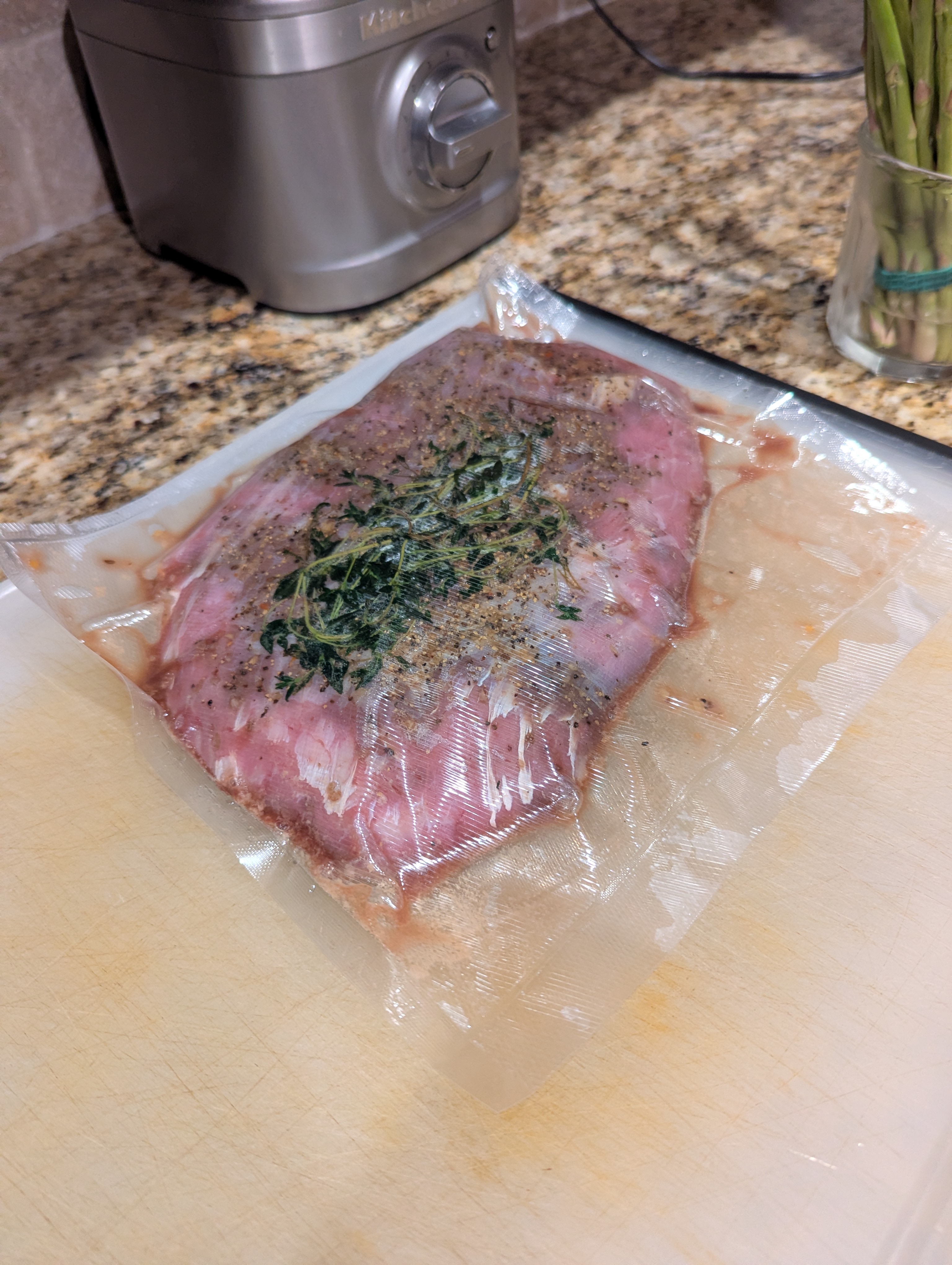 - Season the flank steak generously with Montreal seasoning and place it in a vacuum-sealable bag with thyme. Vacuum seal.